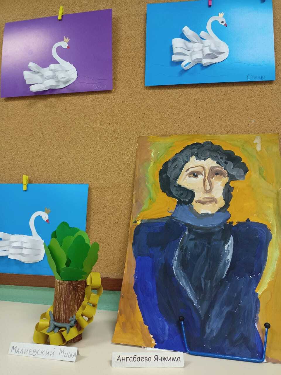 Экспозиция рисунков и поделок из разных материалов по сказкам А. С. Пушкина