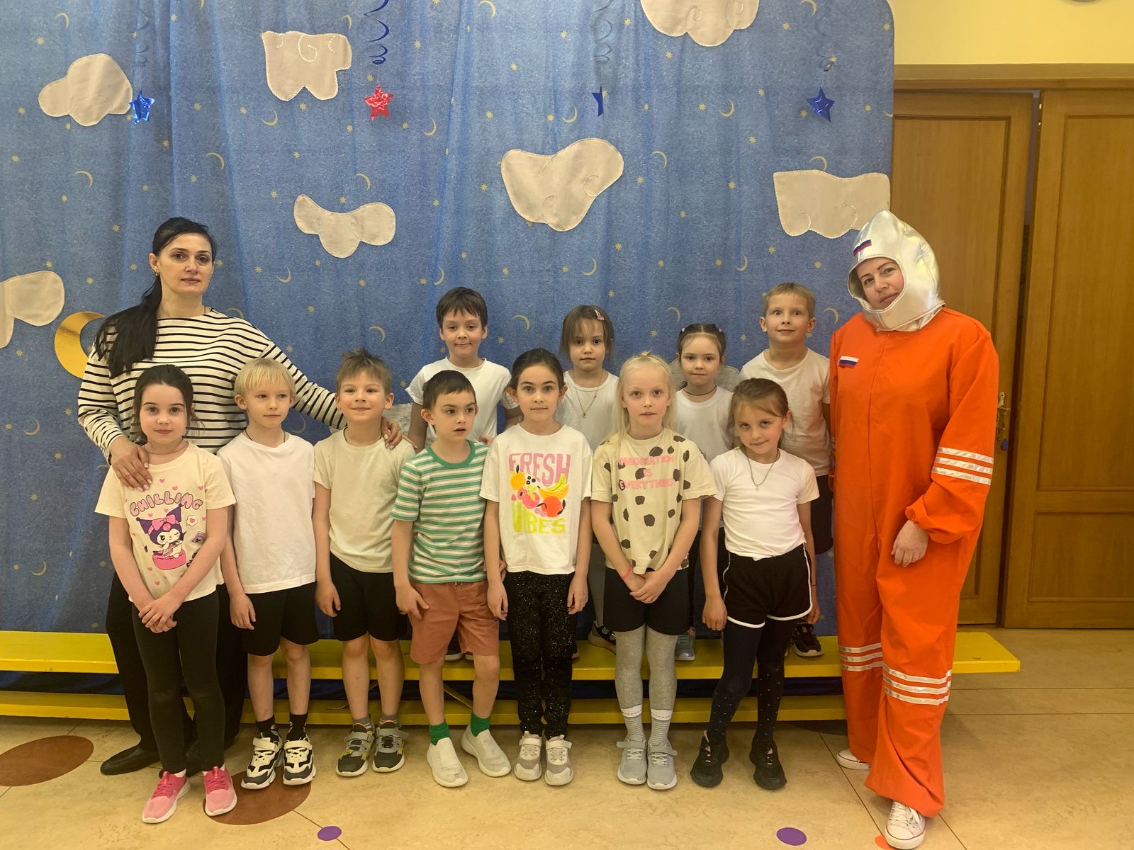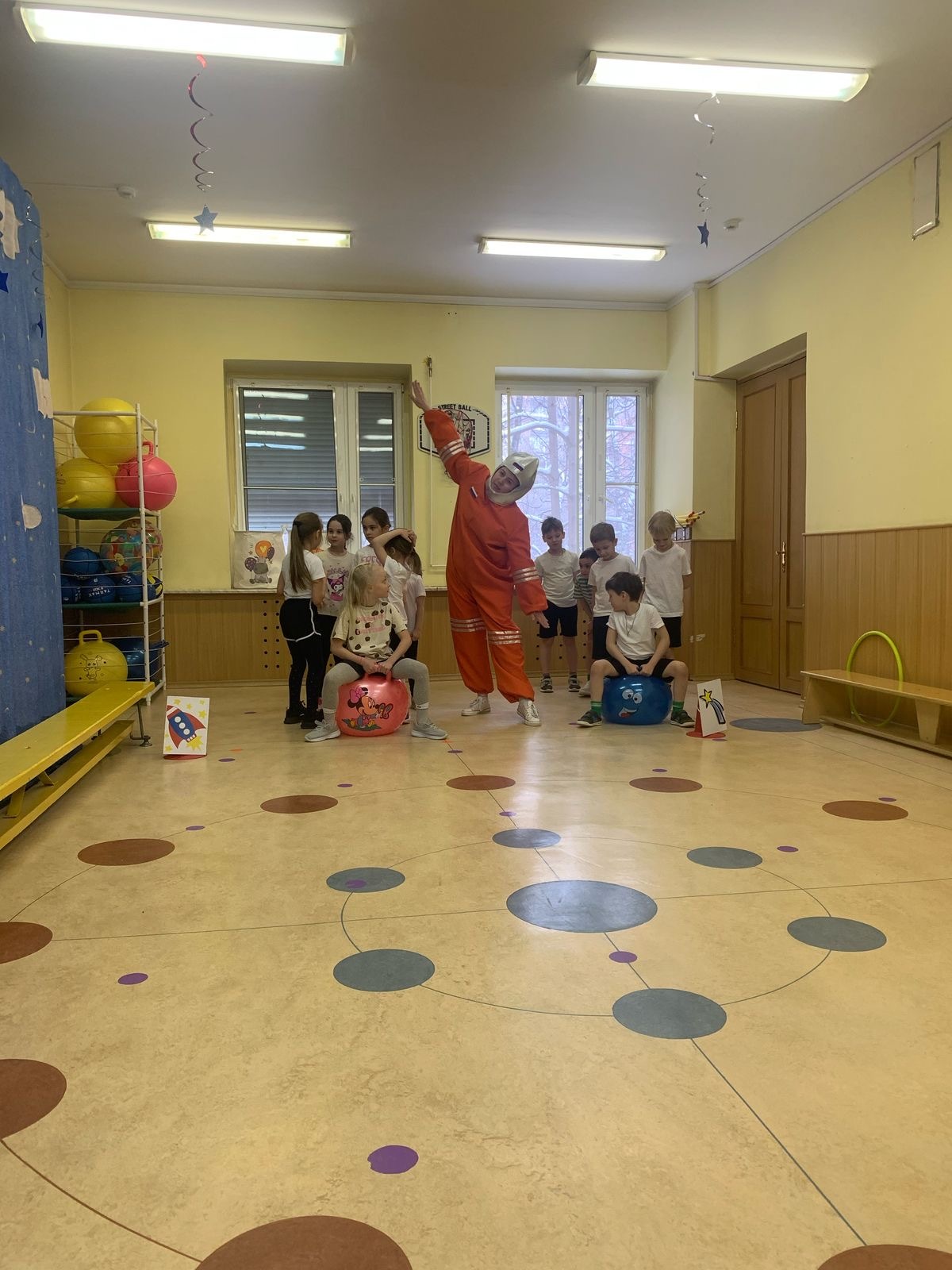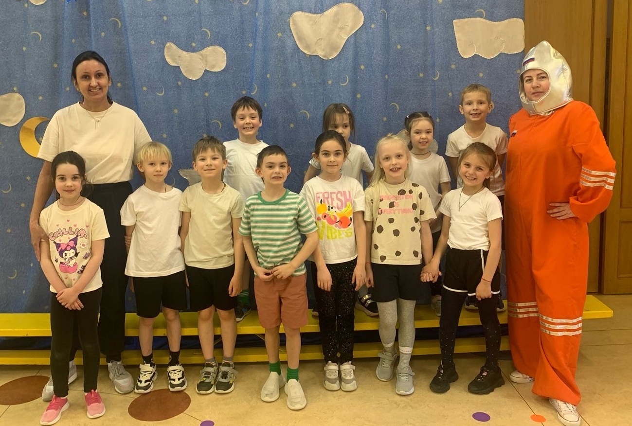 воспитанники группы 4 построили ракету из спортивного инвентаря, выполнили задание по выходу в открытый космос, прокатились на луноходе, в невесомости прыгали на венероболах, переносили марсианский песок, помогали Сатурну собрать кольца и занимались уборкой космического мусора.